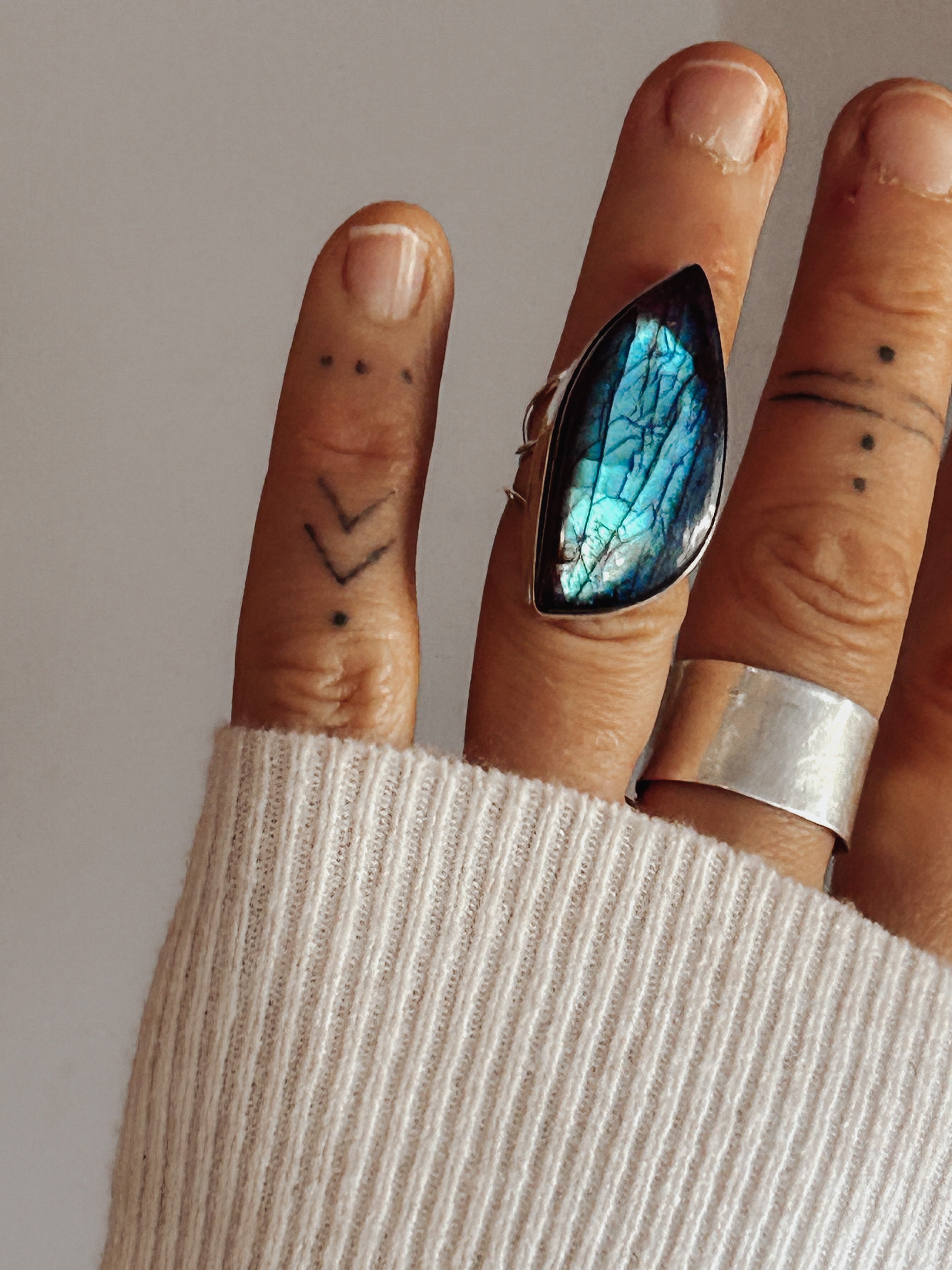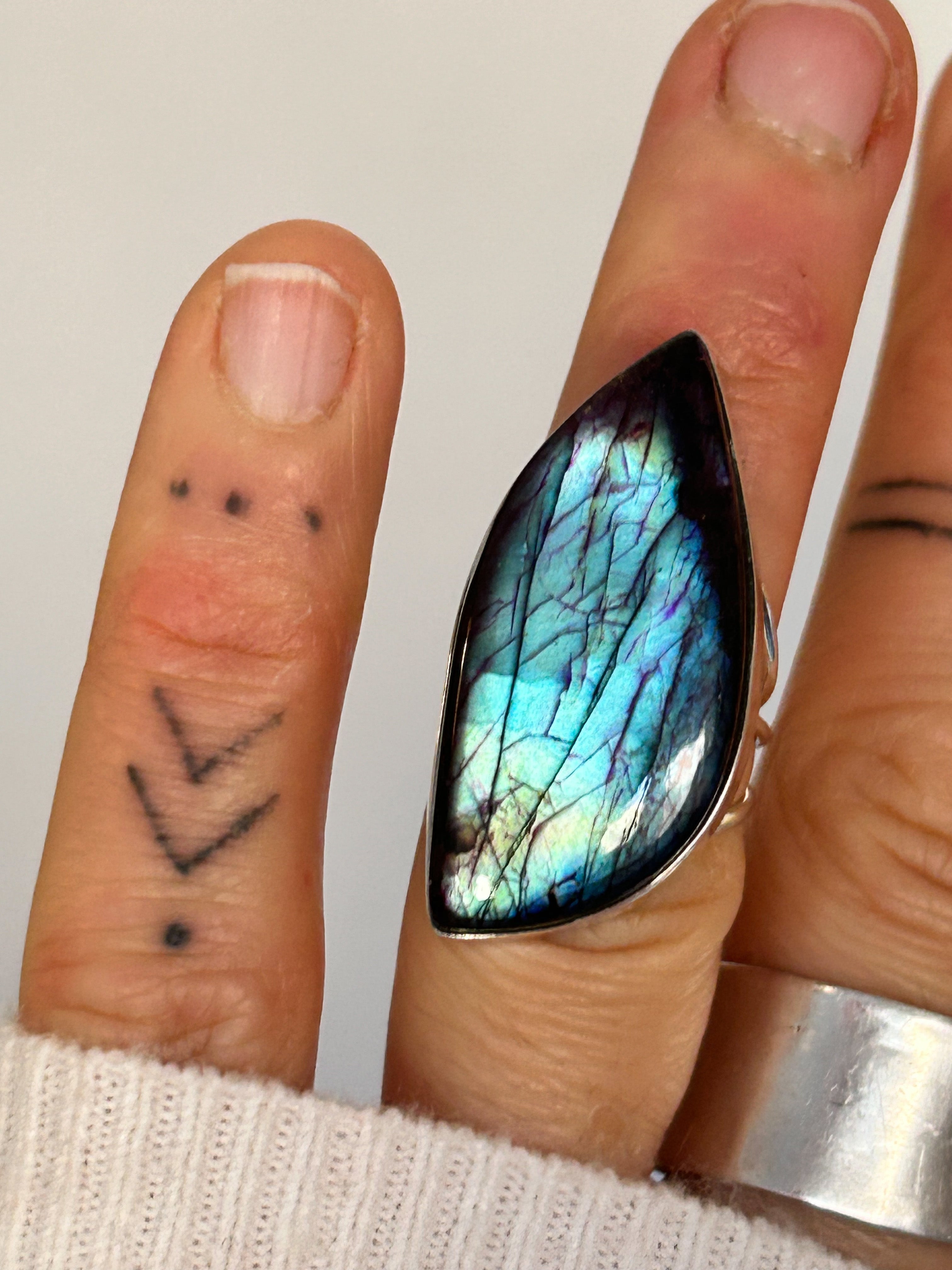 The Labradorite is set in silver and finished on a wide, comfortable band. This ring is designed to be worn as a focal piece — bold, sculptural and unapologetically oversized.