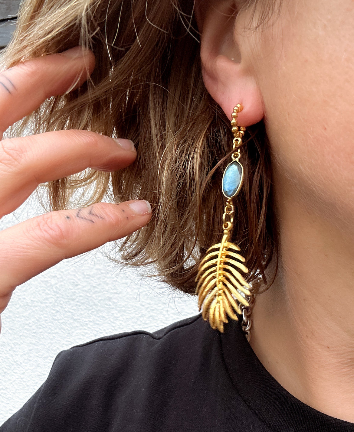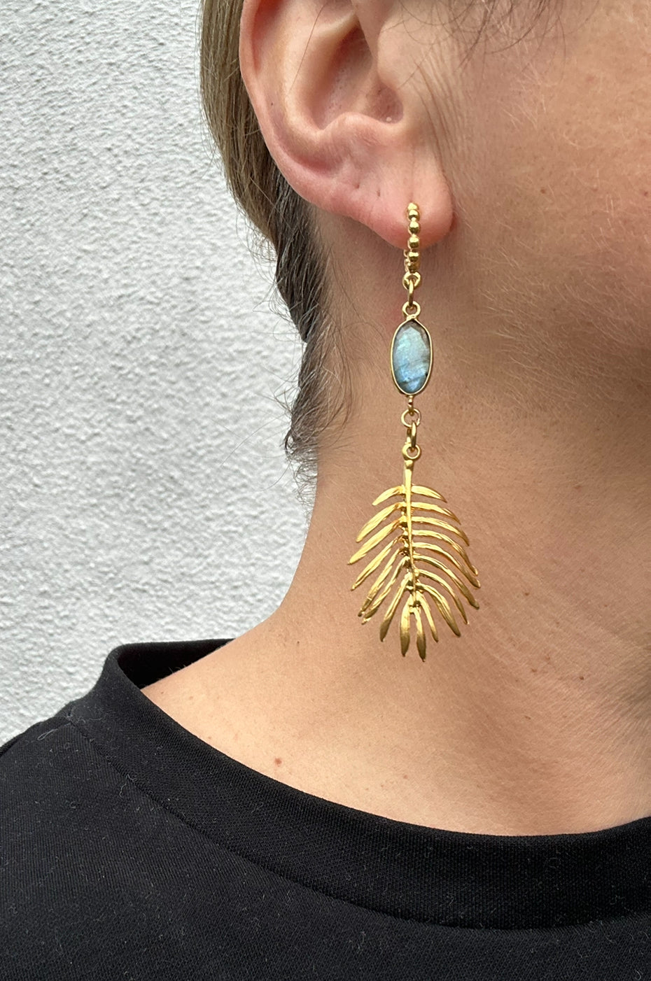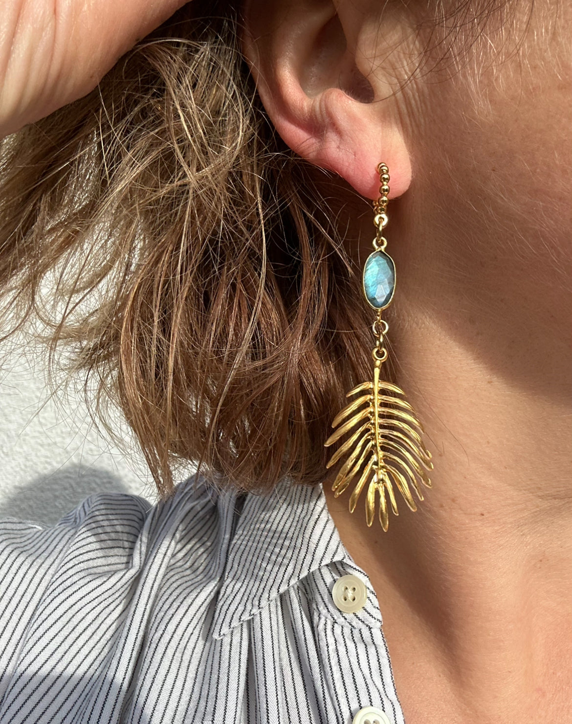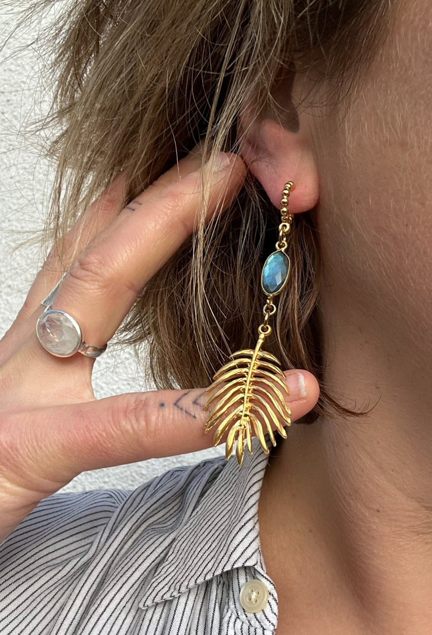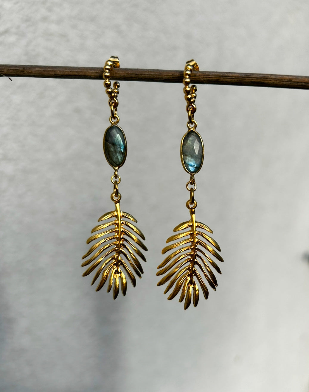 A one-of-a-kind pair of statement earrings featuring beautifully iridescent Labradorite paired with matte-gold palm frond pendants. Each stone has that gorgeous colour play Labradorite is known for — shifting blues and greens that catch the light as you move.