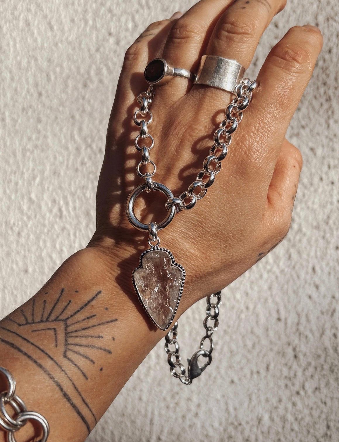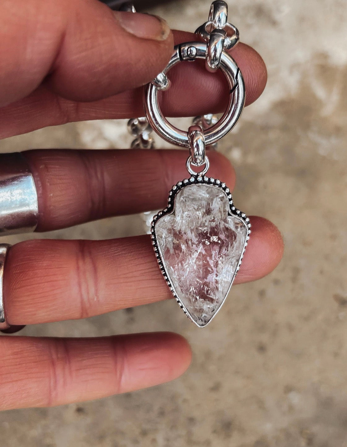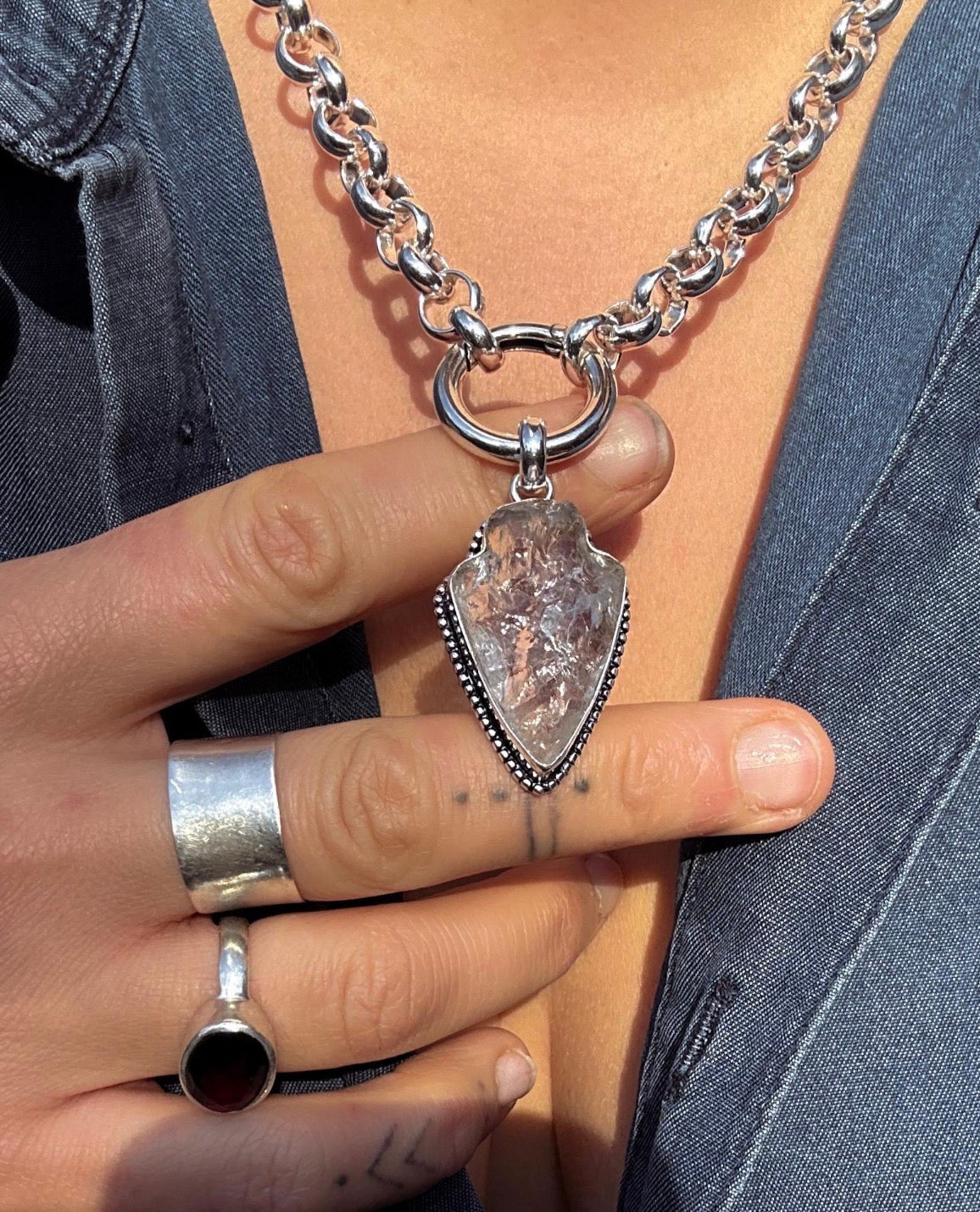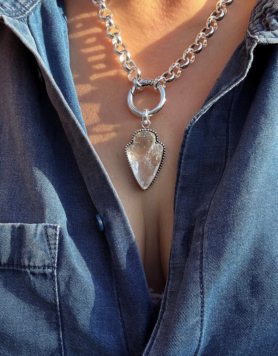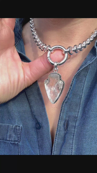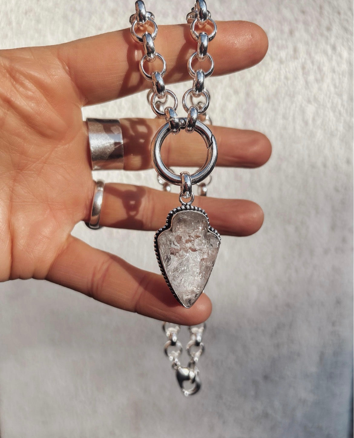 Each raw Quartz arrowhead is handmade to my own design and left intentionally organic, meaning no two pieces are ever the same. The pendant is suspended from a solid circular carabiner clasp, used as a visible design feature for a strong, modern finish.