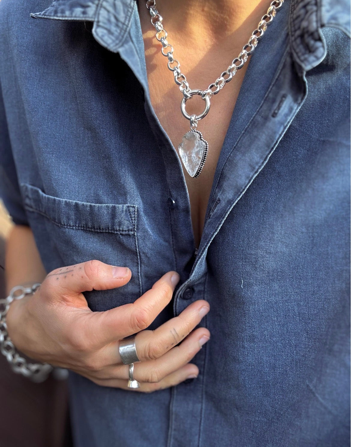 Finished with a 10mm chunky silver-plated zamak chain, made in Europe and chosen for its weight and quality. This necklace has a substantial feel and a confident southwestern edge.