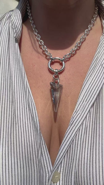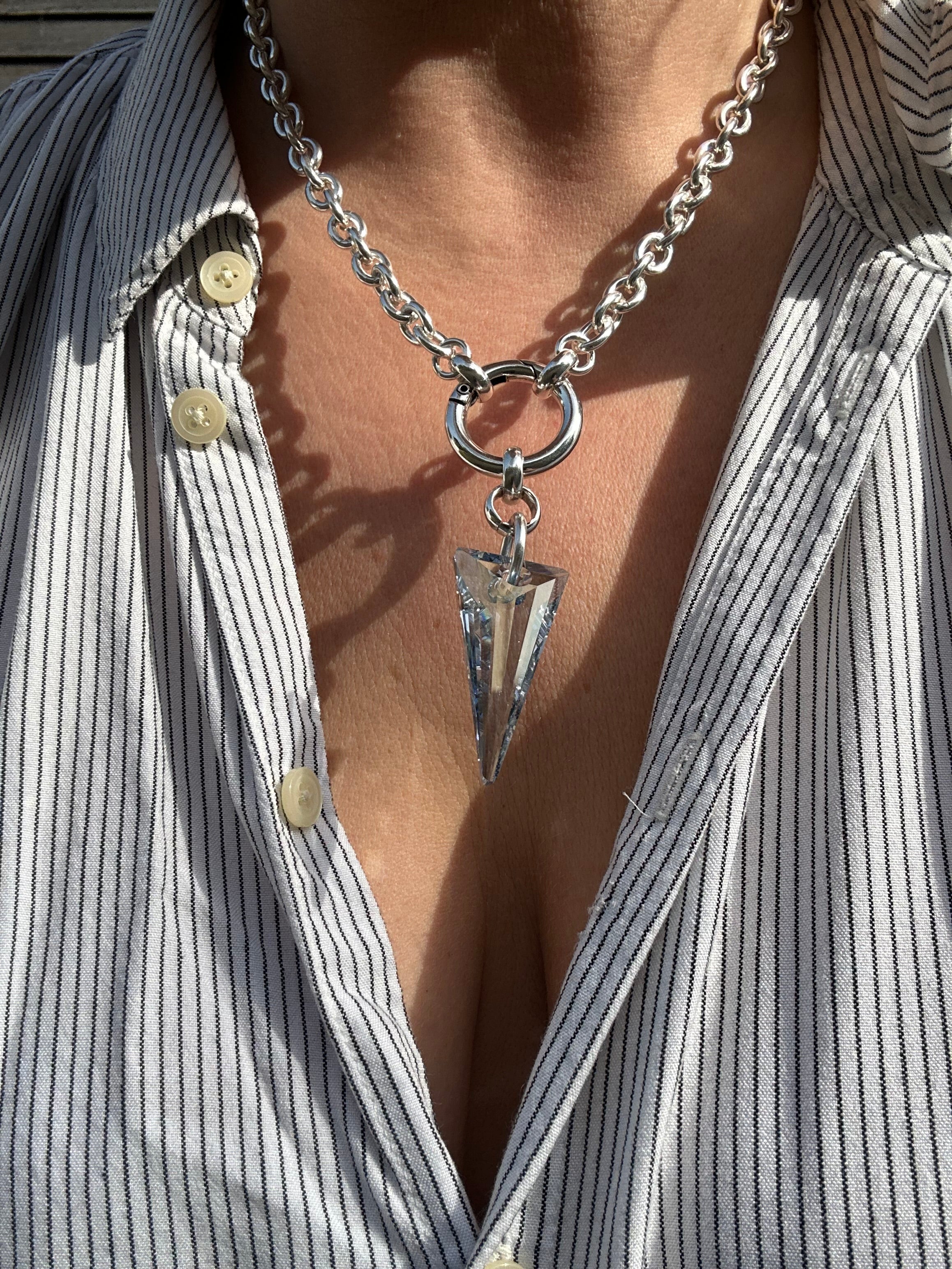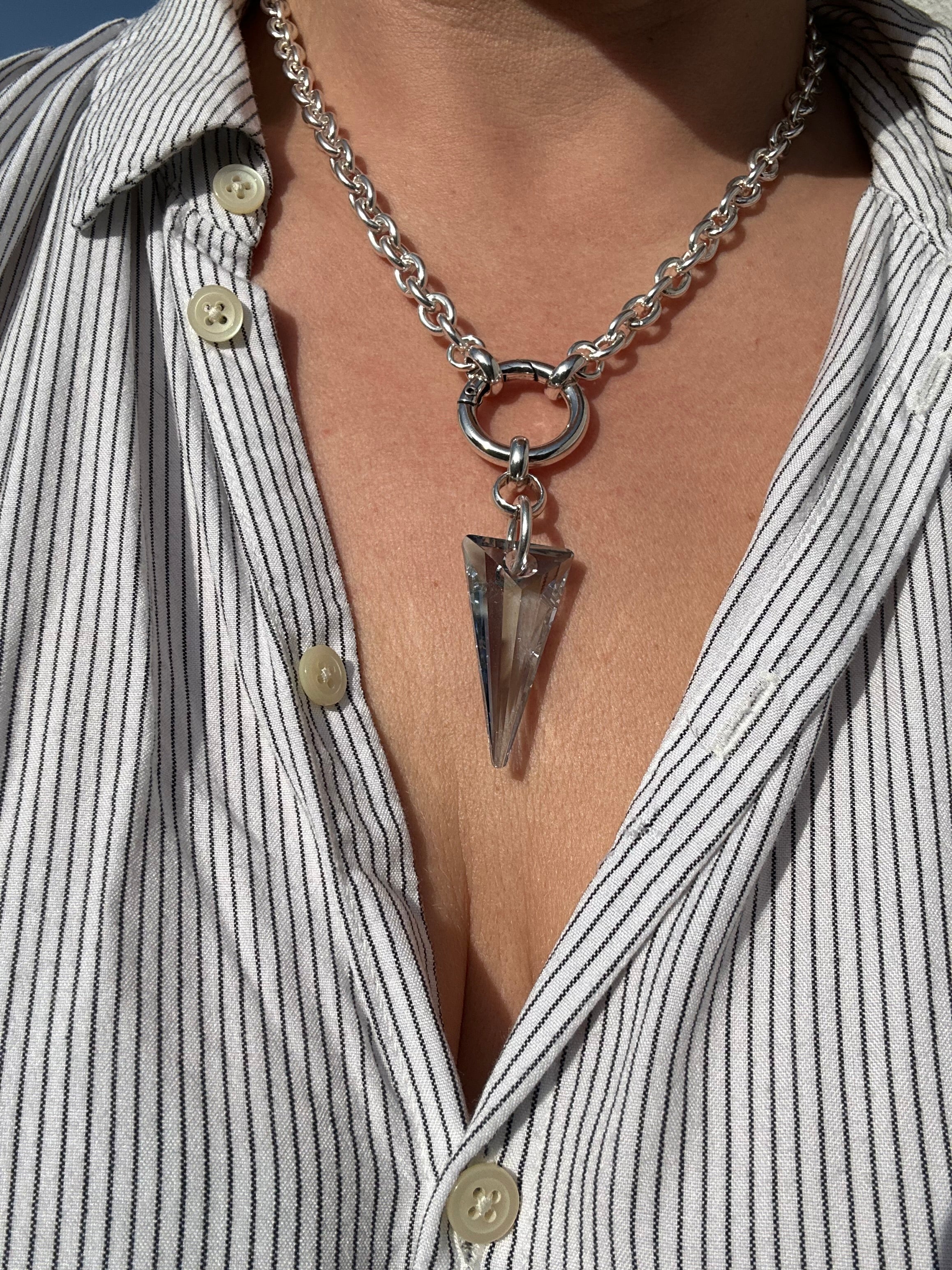 The 39mm faceted spike hangs from a bold silver-plated cable chain, creating a strong architectural line that sits beautifully against open necklines. It’s statement-making without being overpowering — striking, but still completely wearable day to day.