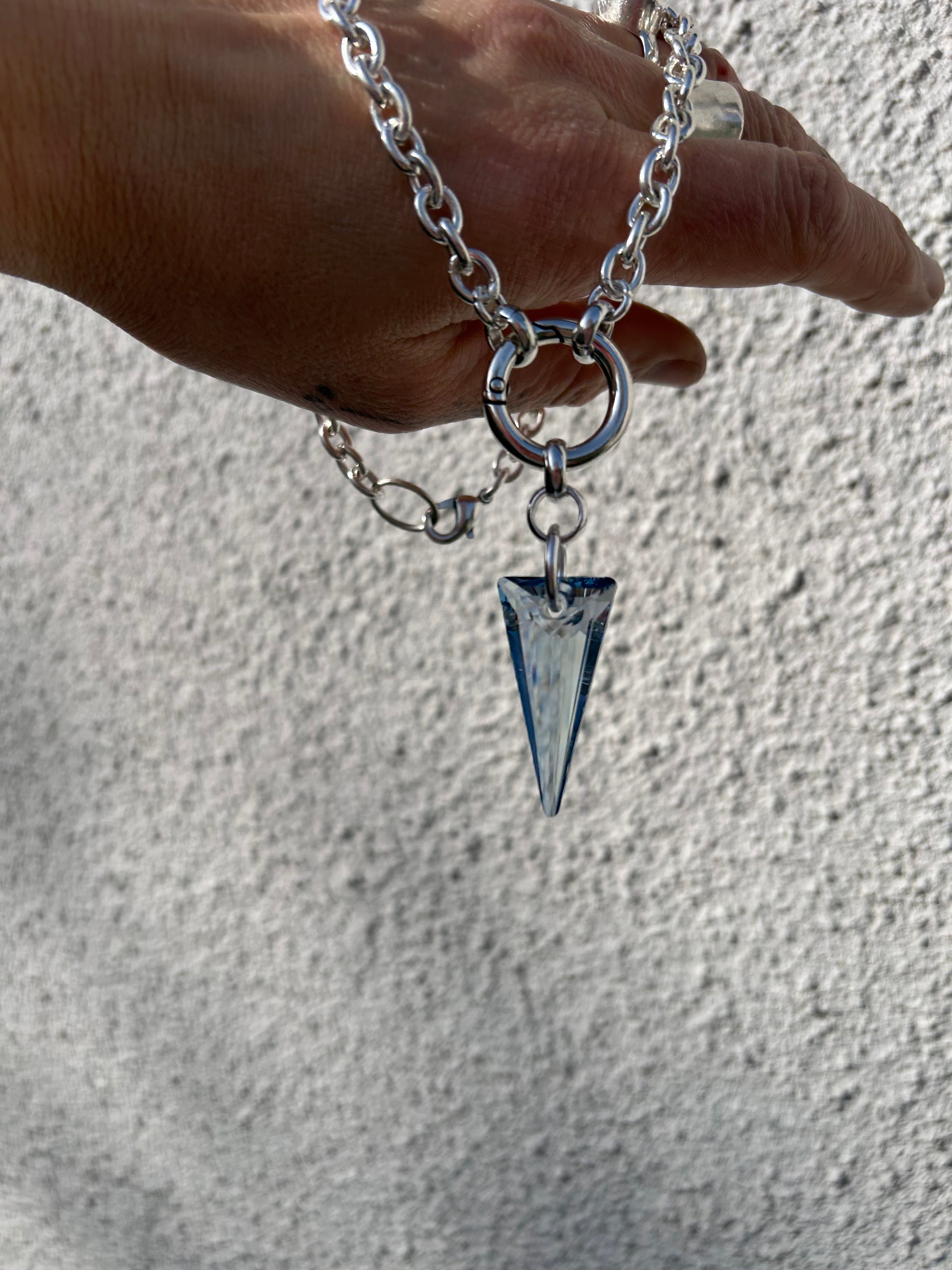 Cool, sharp and quietly powerful, this pale blue Swarovski spike necklace brings a colder edge to the original clear design. The precision-cut crystal has a subtle icy tint — almost clear in some light, then softly blue as it catches the sun — giving it a cleaner, more sculptural feel.
