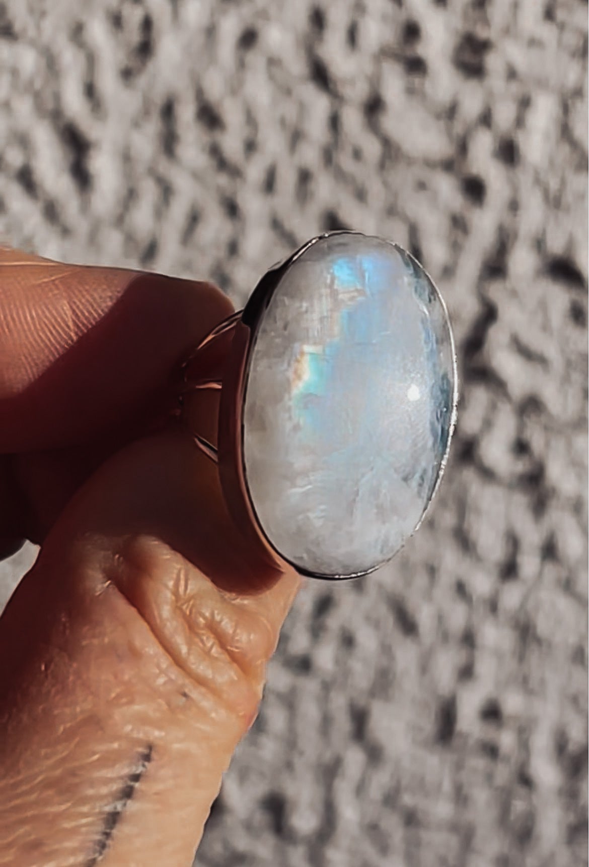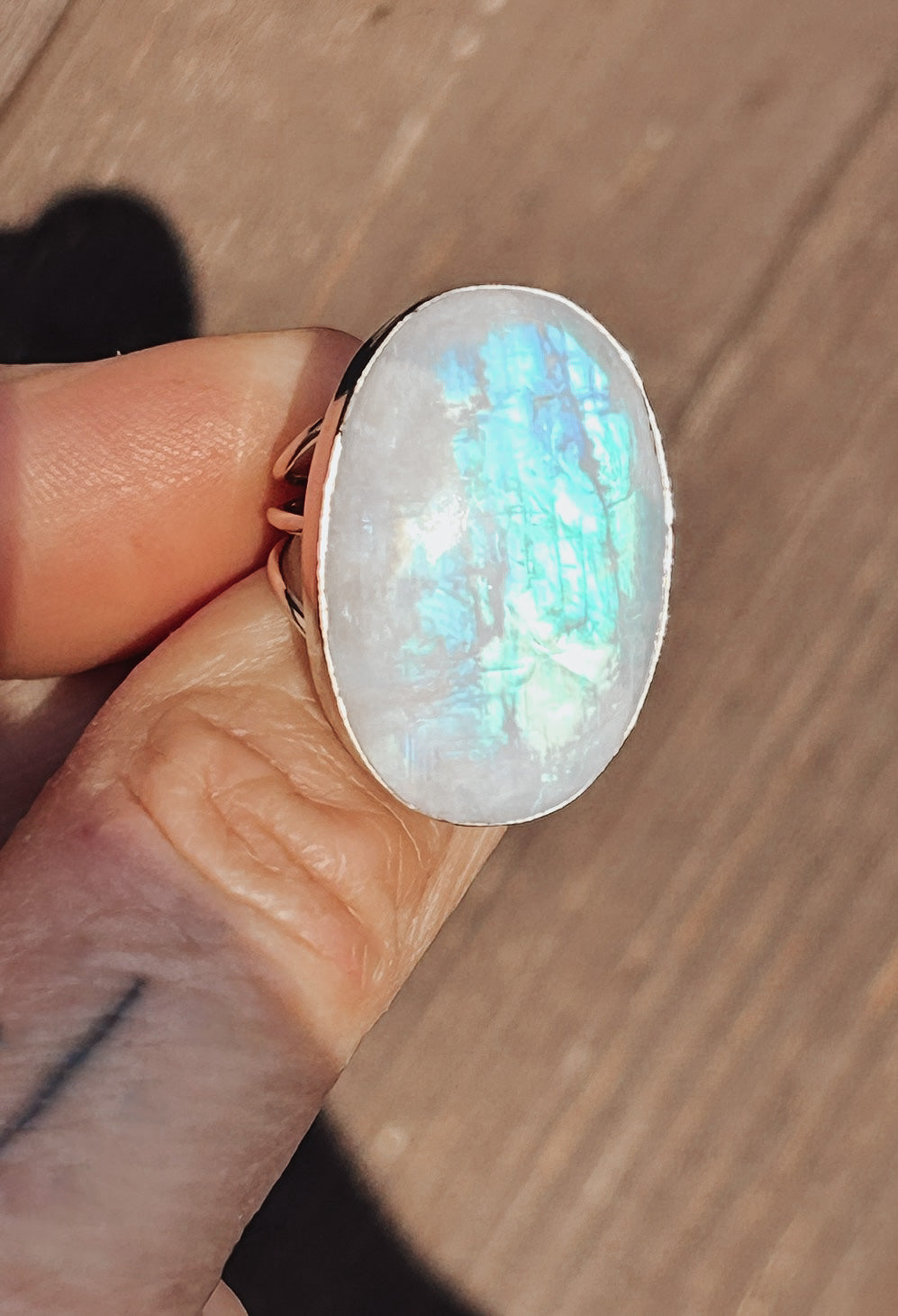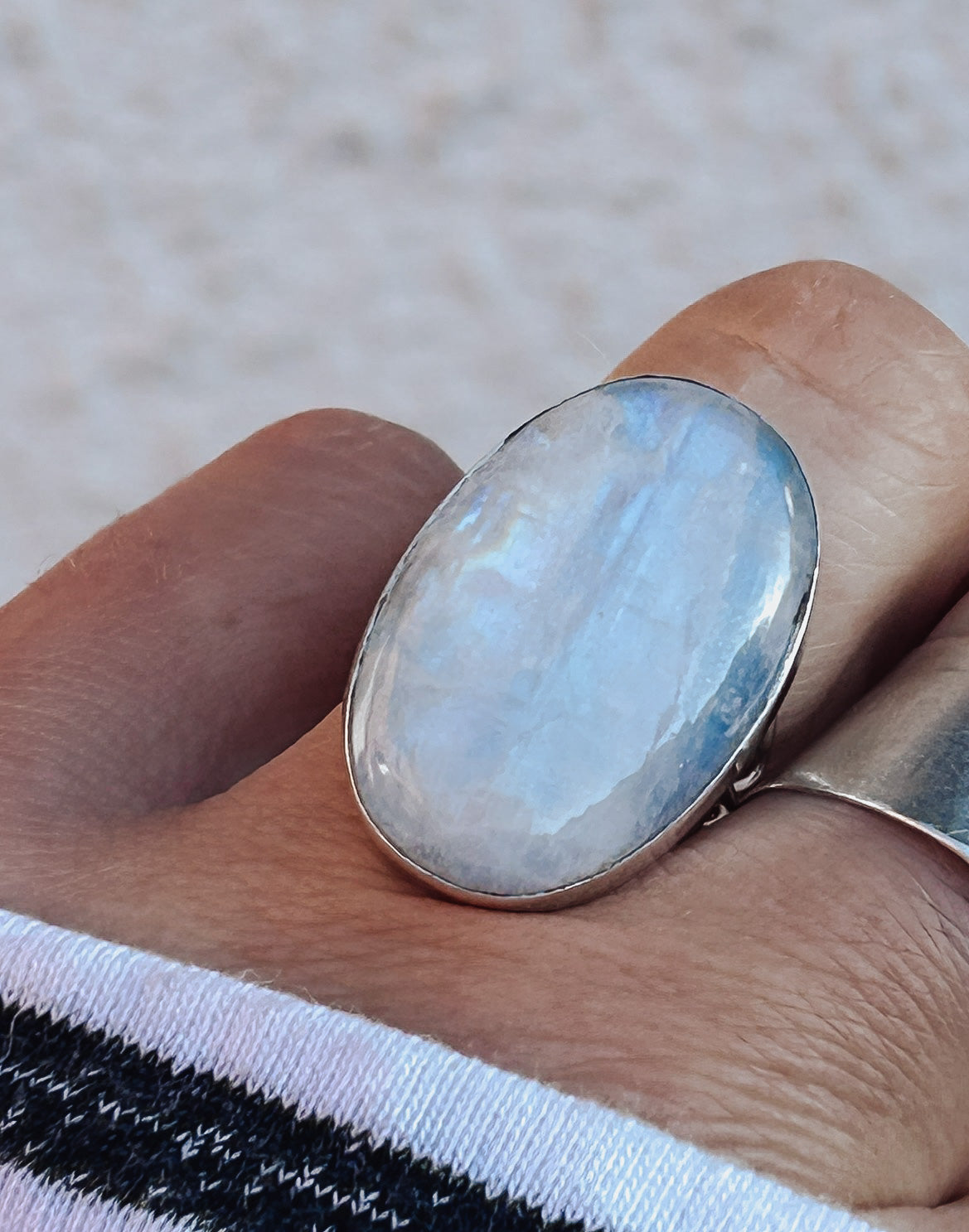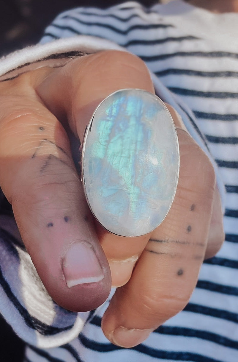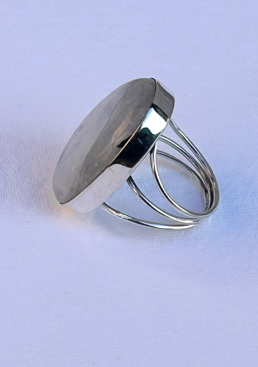 A commanding Rainbow Moonstone ring featuring an oversized 30mm x 22mm oval cabochon set in a substantial sterling silver bezel.