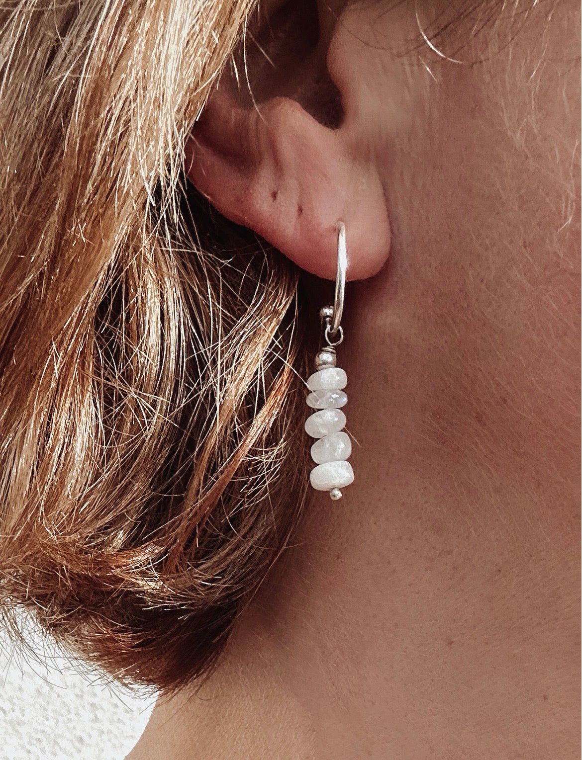 Softly luminous and easy to wear, these sit close to the ear with a delicate 22mm drop (excluding hoop). The stacked Moonstone discs add subtle movement and a natural glow without overpowering.