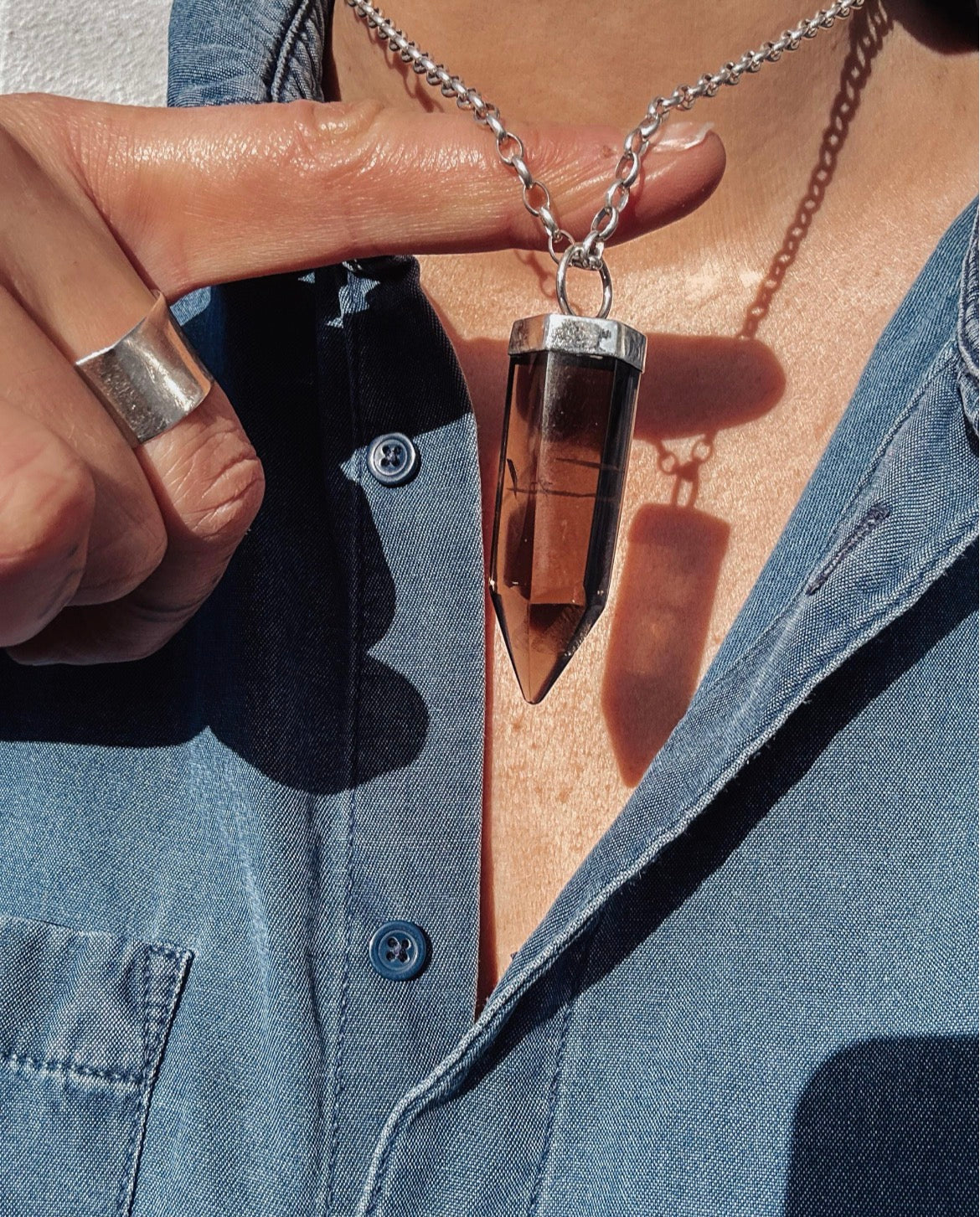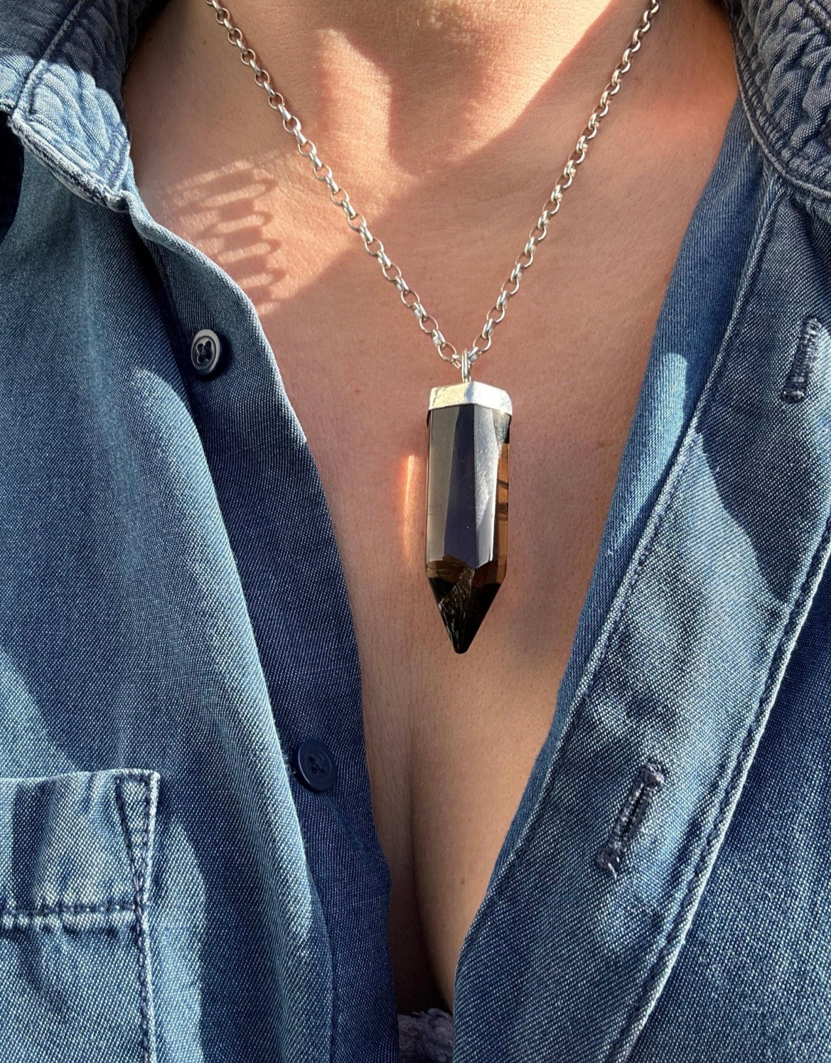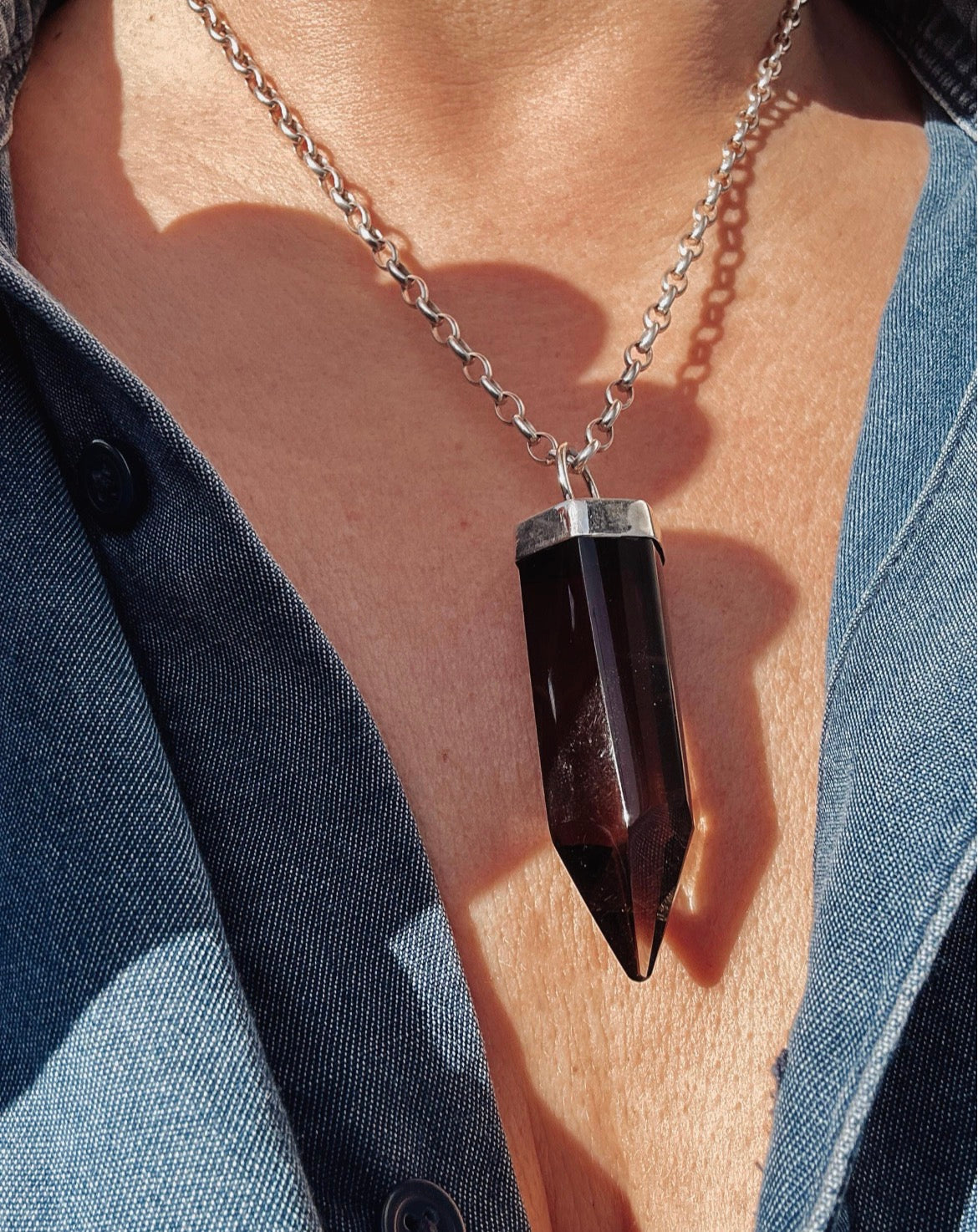 This oversized Smoky Quartz point has a deep, smoky tone with natural internal markings that catch the light through the faceted surface. It feels solid in the hand and grounded when worn.