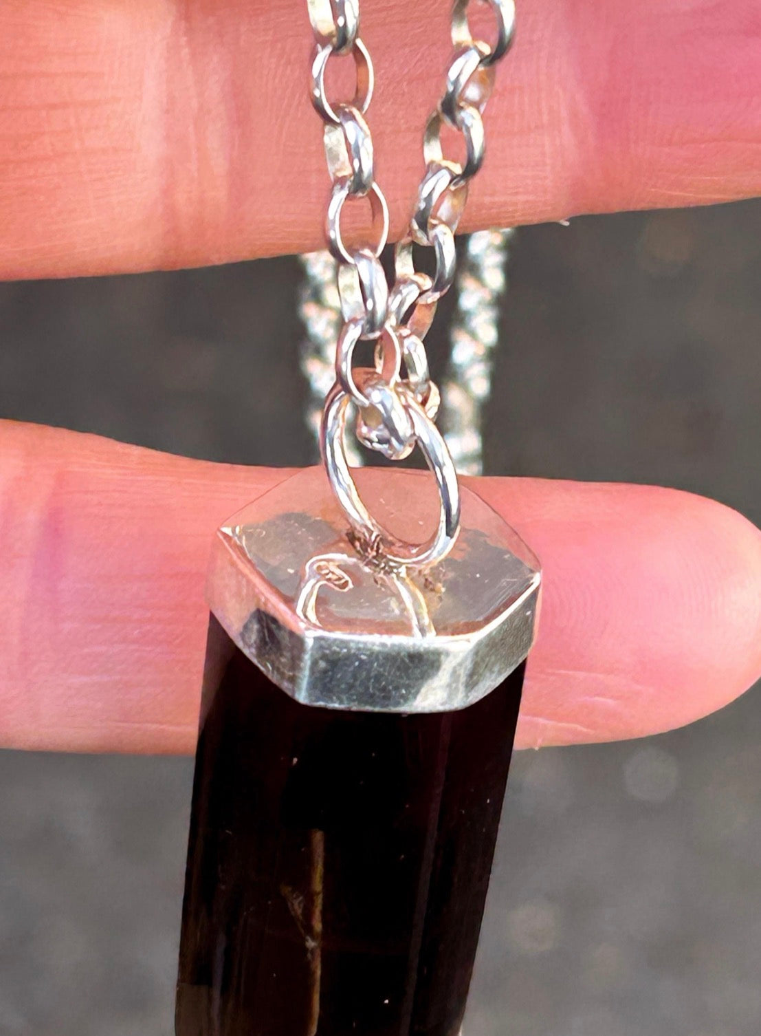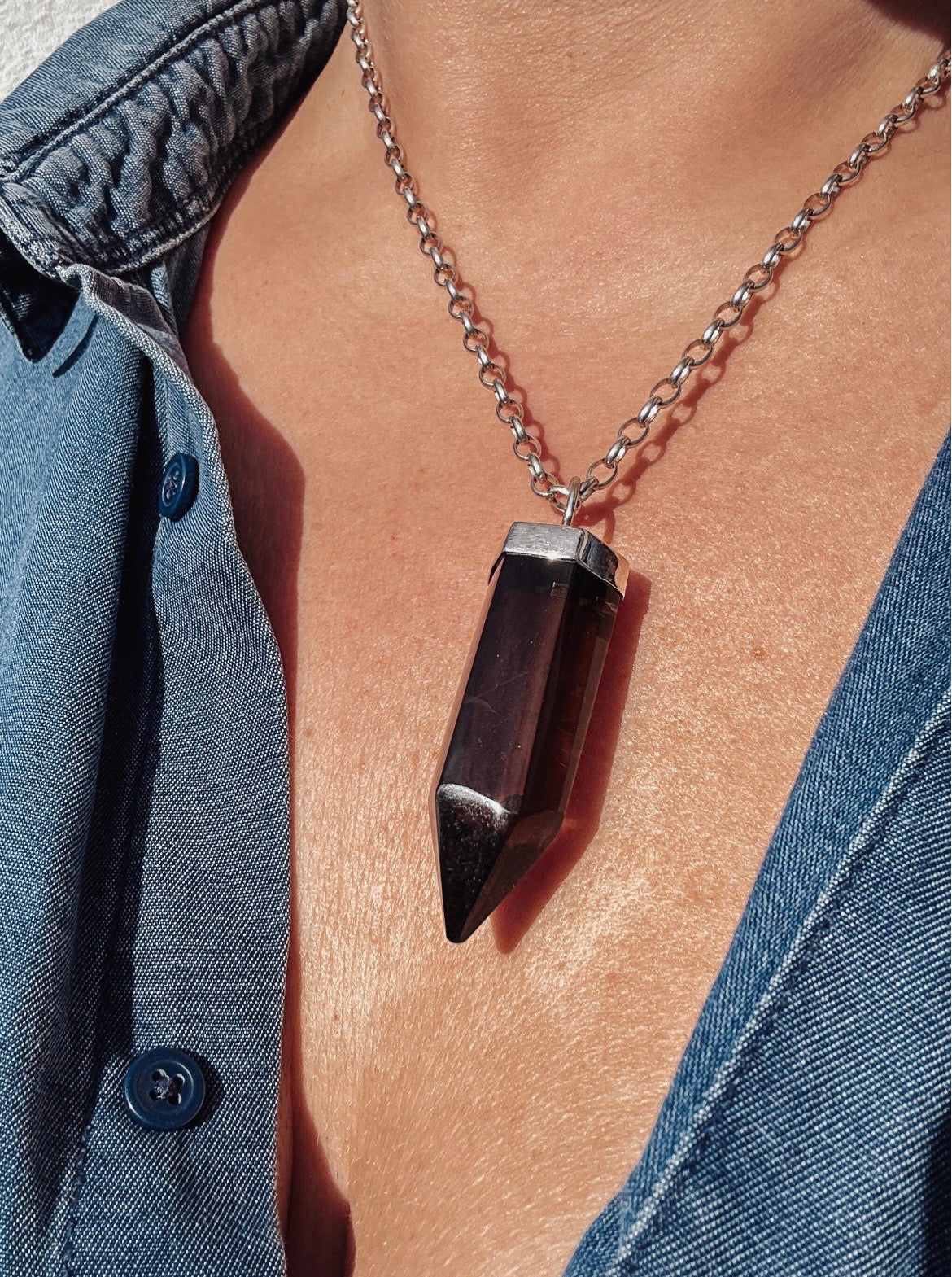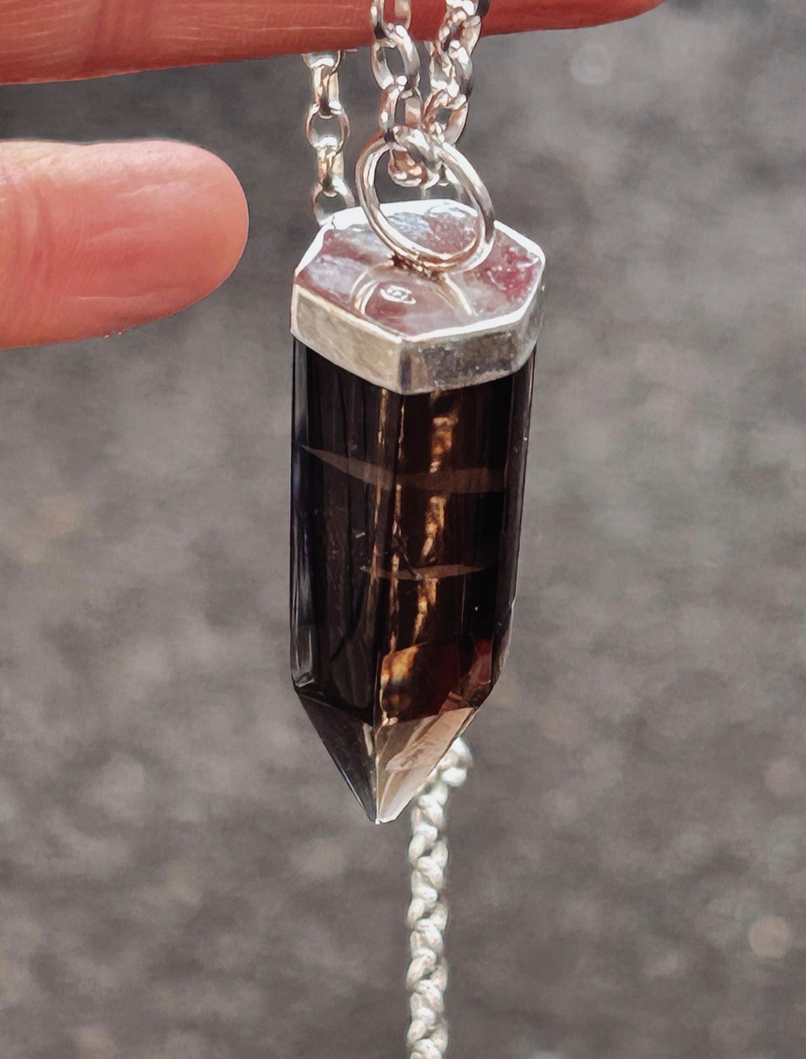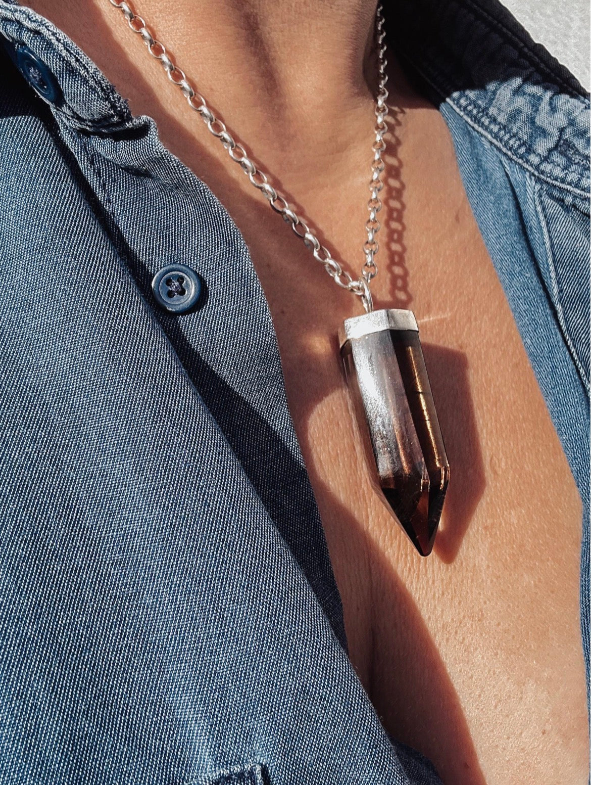 This oversized Smoky Quartz point has a deep, smoky tone with natural internal markings that catch the light through the faceted surface. It feels solid in the hand and grounded when worn.