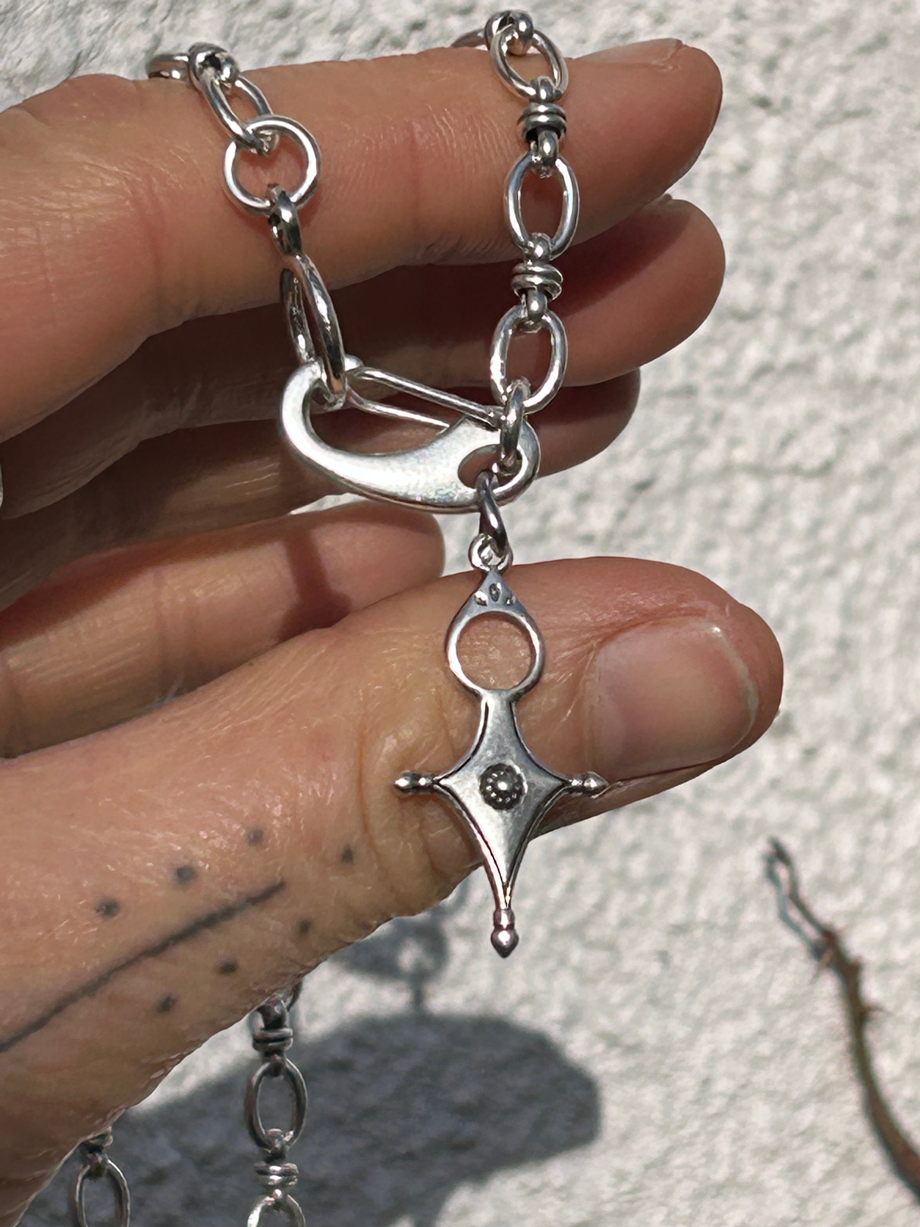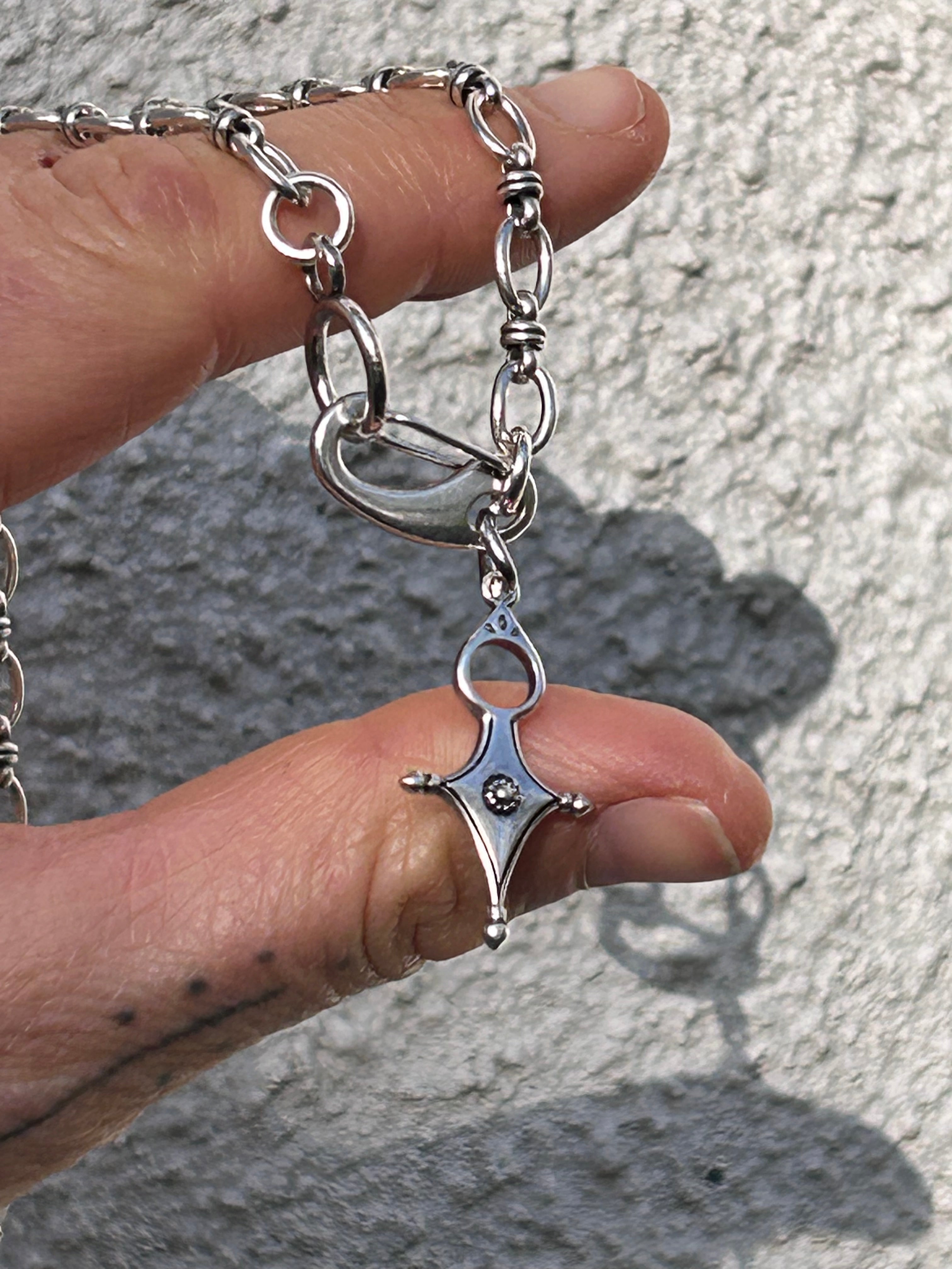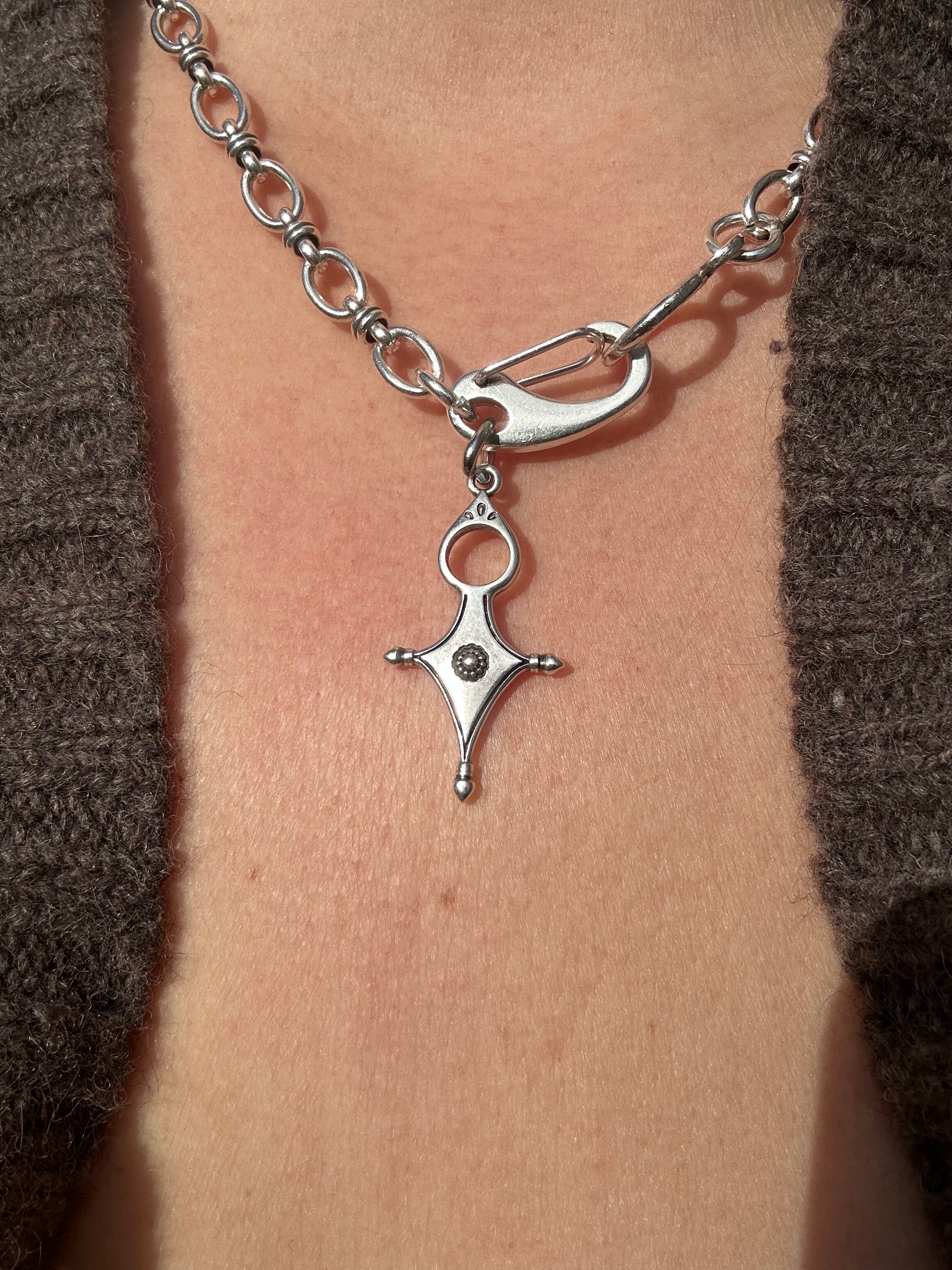 This limited edition contemporary necklace is built around contrast and simplicity — a bold but refined oval chain, a sculptural carabiner-style clasp, and a small talisman charm that hangs cleanly at the front.