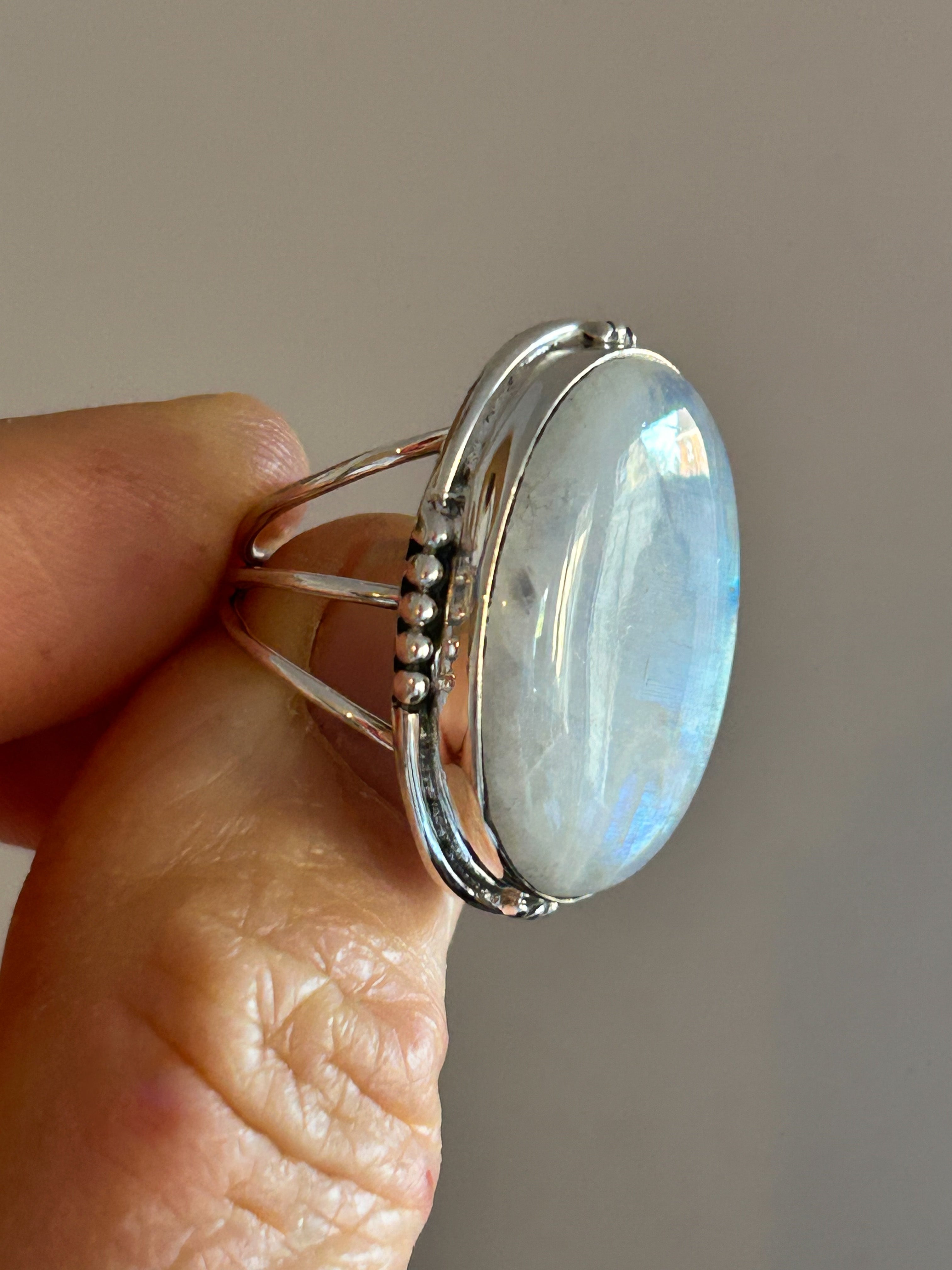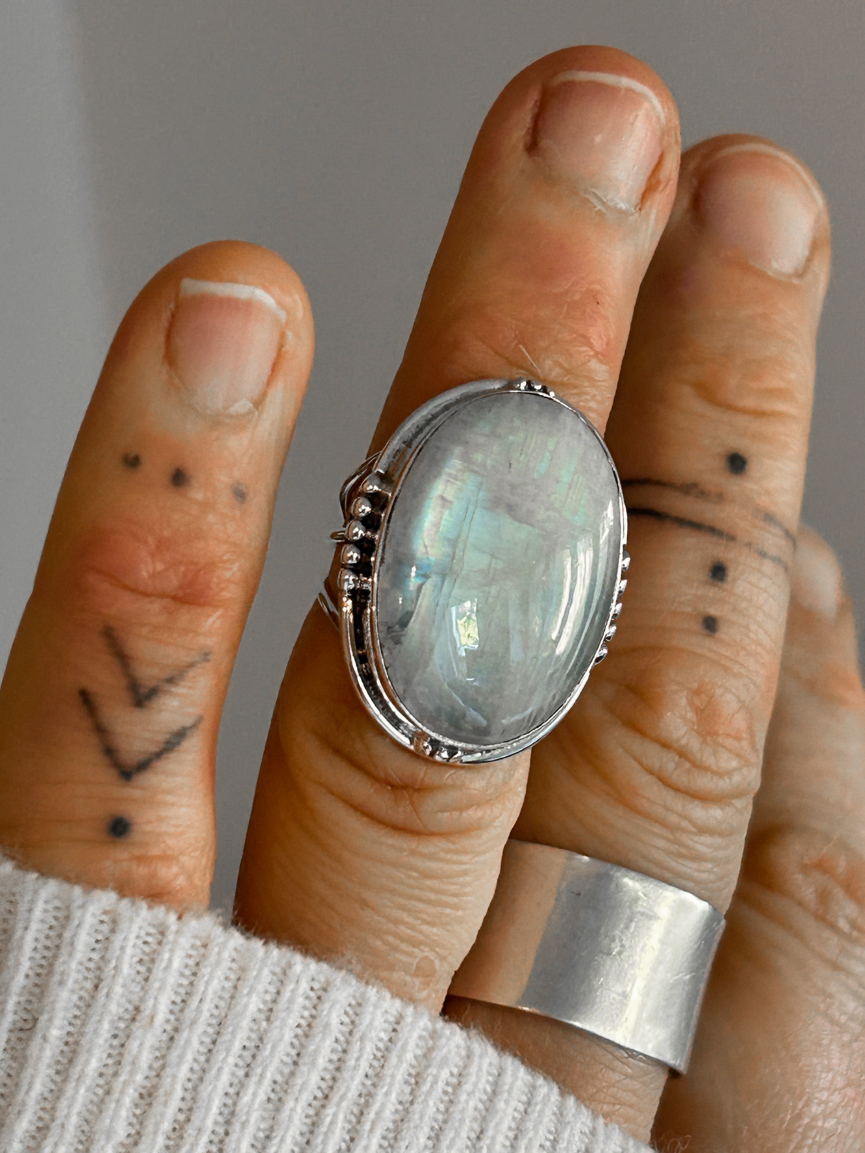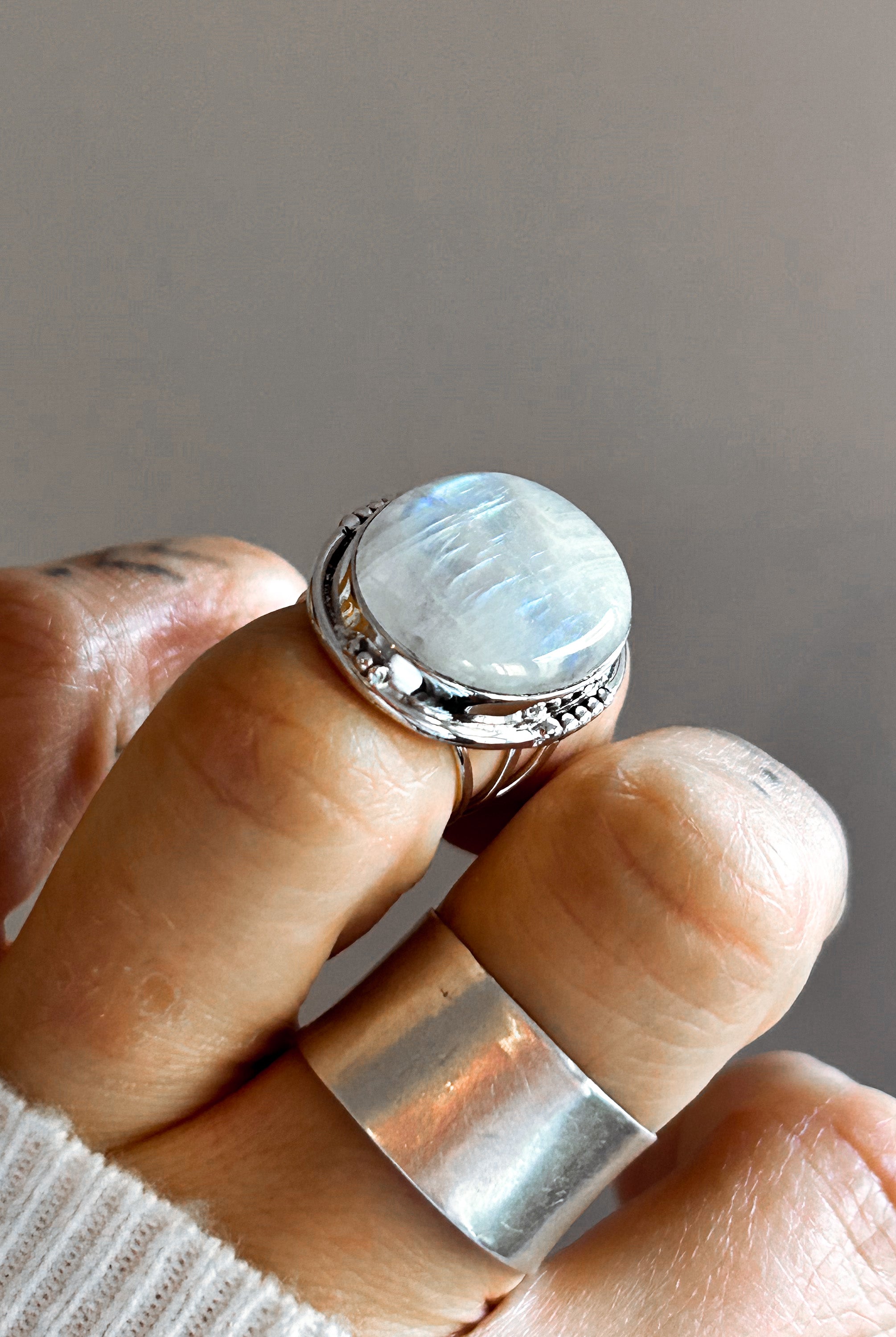 A one-of-a-kind Moonstone statement ring with a soft, luminous blue flash that moves gently across the surface in the light.
