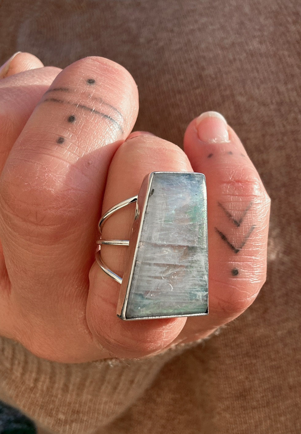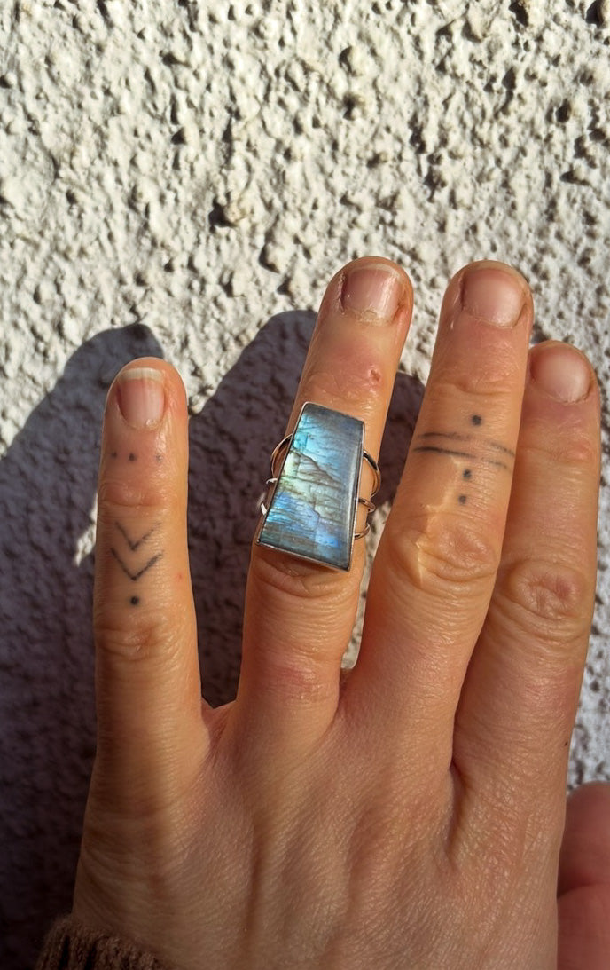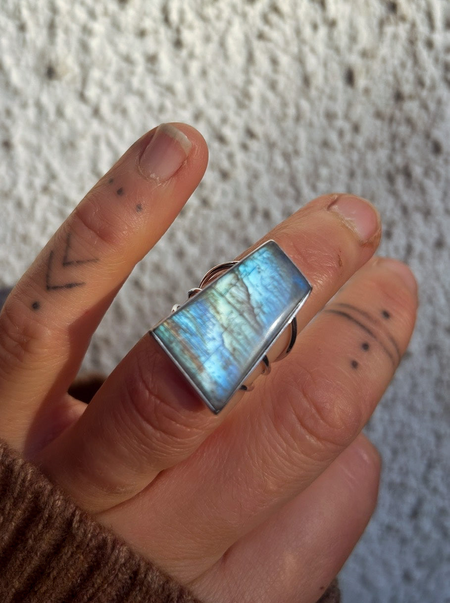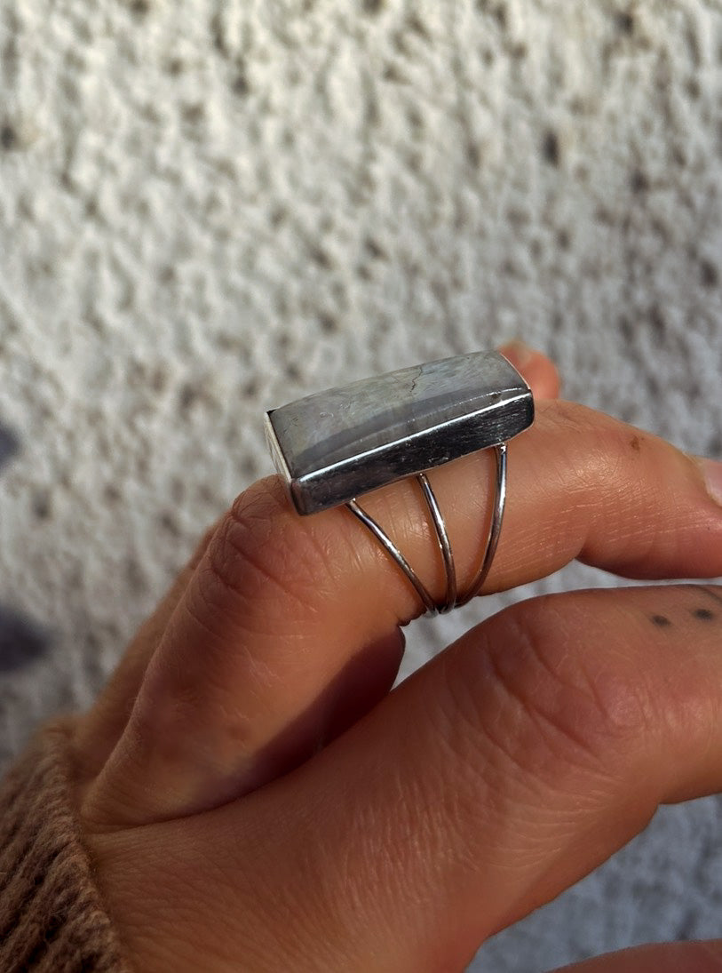 A bold trapezoid Moonstone ring with beautiful blue flash that shifts as the light hits it. The tapered stone gives it a clean, architectural feel, while the triple band sterling silver setting adds weight and presence without feeling heavy on the hand.