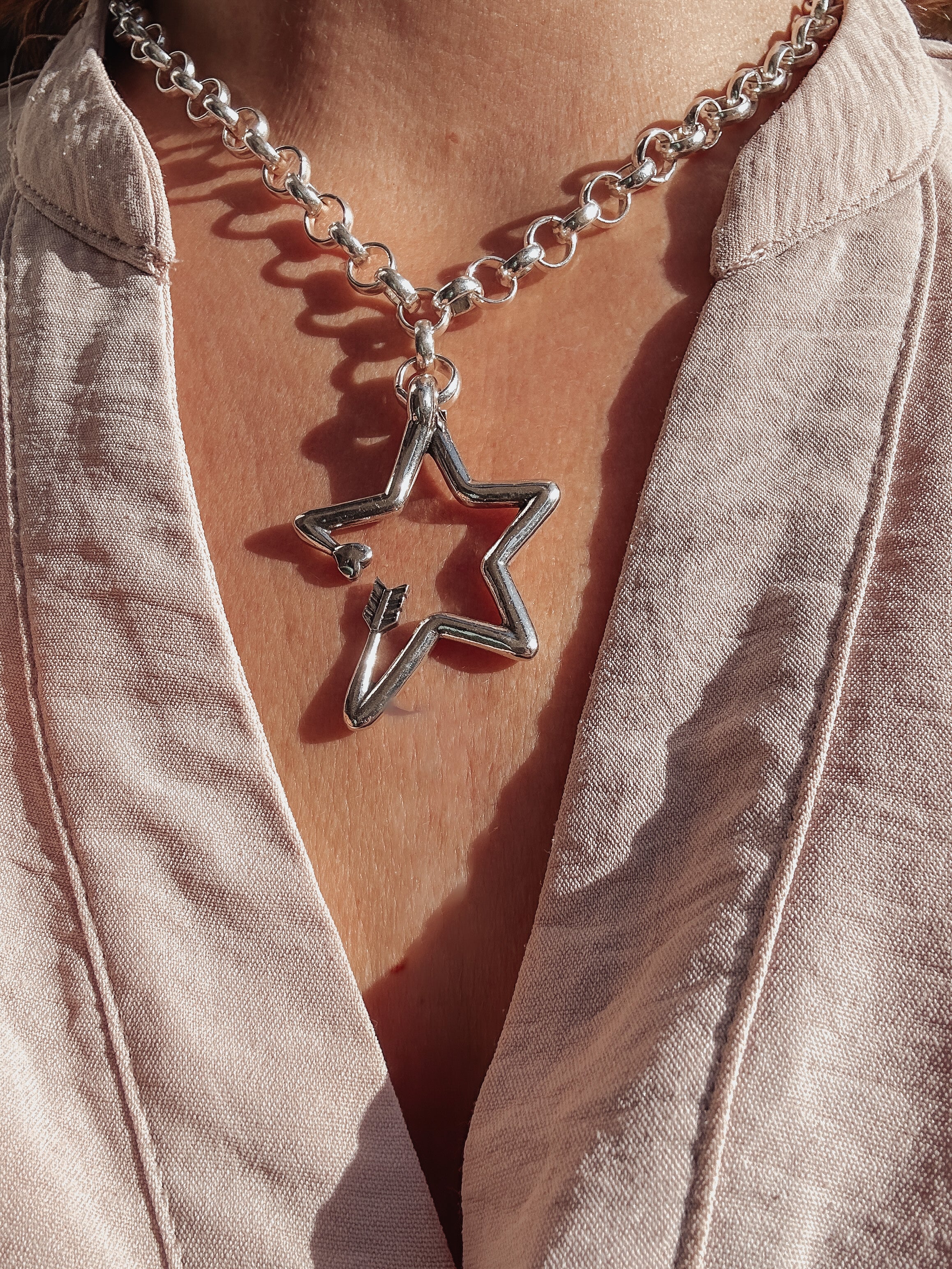 bold, sculptural star pendant with a playful edge — pierced by a tiny arrow for a touch of attitude. Its open, fluid shape and chunky rolo chain create a statement piece that feels both modern and relaxed.